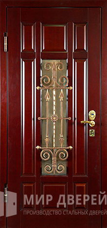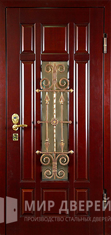 Кованная остекленная дверь в дом усиленная №5 представляет собой отличный выбор для частного дома или коттеджа, обеспечивая не только безопасность, но и добавляя эстетическую привлекательность благодаря элементам ковки. Внешняя и внутренняя отделка двери выполнены из МДФ ПВХ, что гарантирует долговечность и лёгкость ухода.